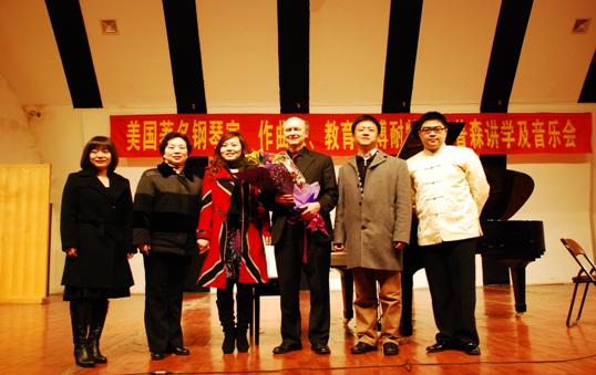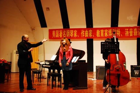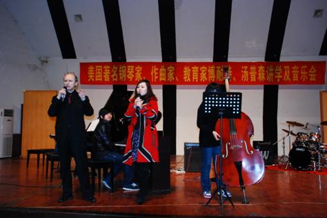 在下午的演奏会上,博耐特·汤普森先生用钢琴为全校师生演奏了美国的爵士音乐。其中钢琴与中国的二胡演奏同时进行时,把演出推向了高潮,在场的老师和员工报以热烈的掌声。