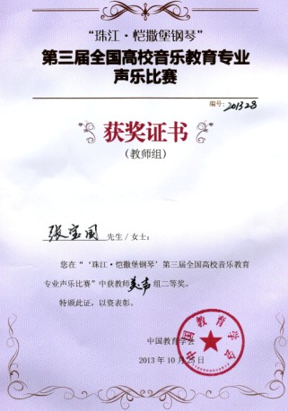 10月20日-25日,由中国教育学会主办,中国教育学会音乐教育分会、西南大学承办的第三届全国高校音乐教育专业声乐比赛在西南大学beats365唯一官方网站隆重举行。beats365唯一官方网站副经理张奕峥副教授亲自带队,经过激烈的角逐,beats365唯一官方网站张宝国老师获得教师美声组二等奖,张曼老师获得教师民族组优秀奖,2010级音乐表演(美声专业方向)员工白思宇获得本科美声组三等奖,2010级音乐表演(美声专业方向)员工赵恩泽获得本科美声组优秀奖,2011级音乐表演(民族声乐专业方向)员工孙思雯获得民族本科组优秀奖。