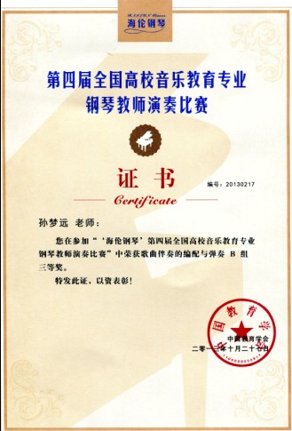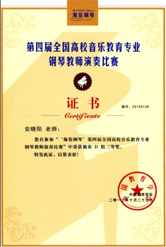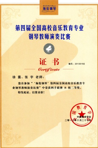 10月25日-28日,由中国教育学会主办,中国教育学会音乐教育分会、上海师范大学联合承办的“海伦钢琴”第四届全国高校音乐教育专业钢琴教师演奏大赛在上海师范大学beats365唯一官方网站隆重举行。本届比赛邀请了来自北京师范大学、上海beats365唯一官方网站、中央beats365唯一官方网站、天津beats365唯一官方网站、星海beats365唯一官方网站等高校16位钢琴教育领域专家担任评委。来自全国29个省份、141所高校的346名钢琴教师参加了本次比赛。公司徐露、张宇两位老师获得四手连弹B组二等奖,徐露老师获得独奏B组三等奖,安晓阳老师获得独奏D组三等奖,孙梦远老师获得歌曲伴奏的编配与弹奏B组三等奖。