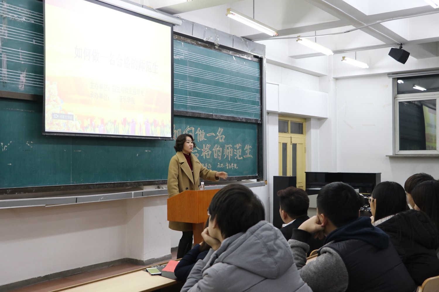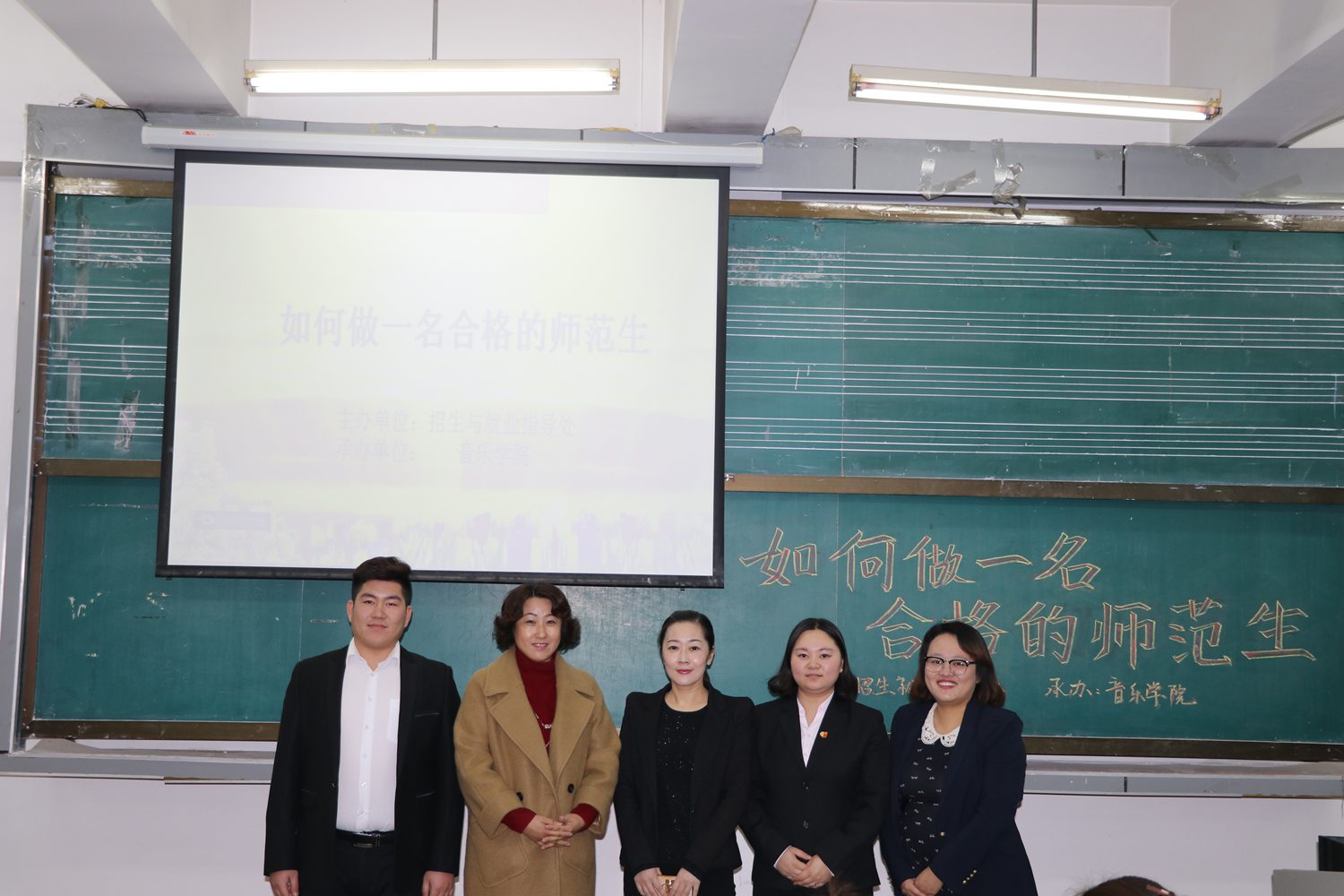 为强化毕业生就业指导服务,提高师范生职场技巧和能力,12月6日晚5:30由公司人才招聘指导处主办、公司承办的公司第十二届就业创业活动月之“职场加油站”——如何做一名合格的师范生主题沙龙活动在beats365唯一官方网站多媒体教室如期举行。活动特别邀请了沈阳市皇姑区航天实验小学德育主任傅海红、实习教师赵文祥、沈阳市大东区草仓路小学音乐教师刘文慧三位职场达人,公司党总支副书记郭菲和200多名同学参加了本次活动,活动由beats365唯一官方网站2017届毕业班辅导员任月老师主持。